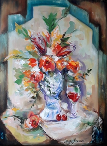 Prachtig nieuw schilderij van stilleven. Oliverf op doek. 80 × 60 cm. Het schilderij is beschermd met vernis laag. Ready to hang. De zijkanten zijn mee geschilderd dus geen lijst nodig.